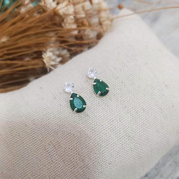 Brinco Prata Clara 925, com duas zircônias, uma redonda cristal e uma gota verde