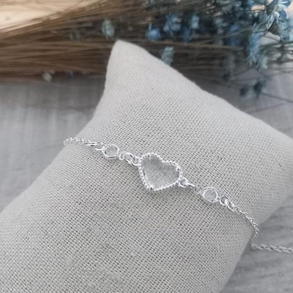 Pulseira em Prata 925, em elos , com coração de cristal ao centro e duas zircônias ao lado.