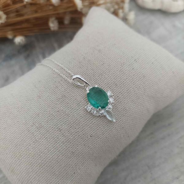 Colar em Prata 925 com pingente Zircônia Verde turmalina , com meia borda cravejada zircônias cristal