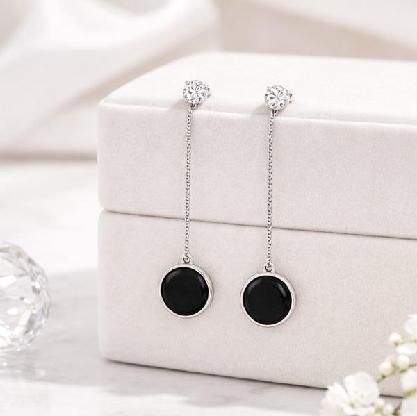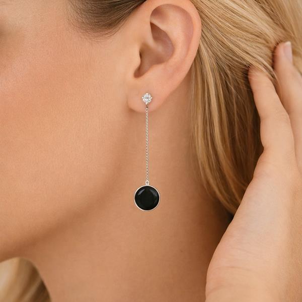 Brinco corrente 3 cm em Prata 952, ponto de luz cristal 4 mm e pedra ônix redonda 9,5 mm