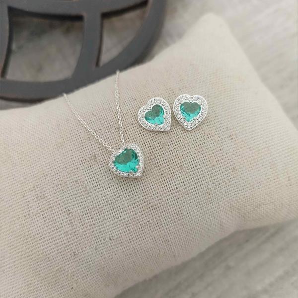 Conjunto em Prata 925 Clara, Brincos e Pingentes com Zircônia em formato de coração Verde Tiffany, com a lateral cravejada de microzircônias cristal com 1 cm .