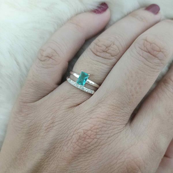Anel em Prata 925, aro liso, dupla Zircônias, um aro com pedra retângula verde 0,5 x 0,3 mm e o segundo aro cravejado com microzircônias cristal.