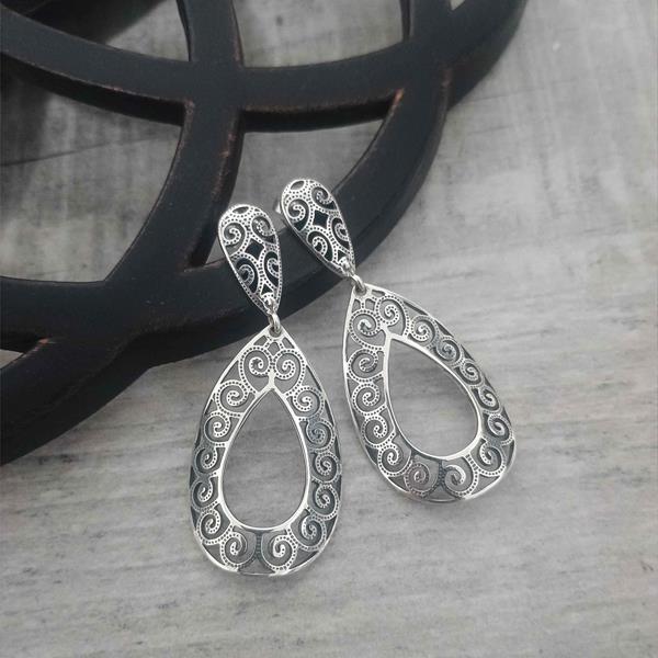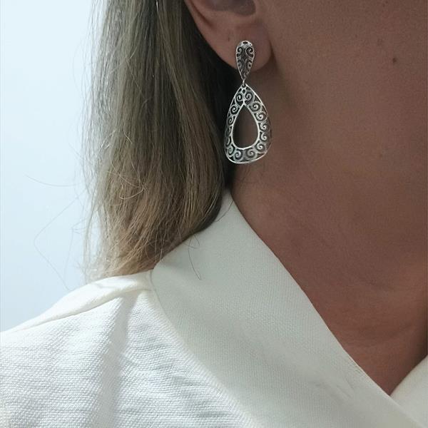 Brinco Gota, com desenhos arabescos vazados Prata 925 com detalhes envelhecidos.
