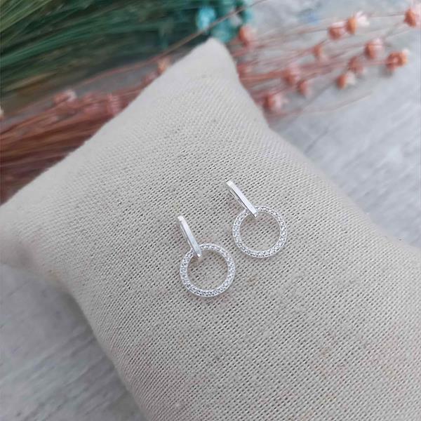 Brinco em Prata 925, com aro retangular liso, e pingente circulo cravejado com zircônia Cristal .